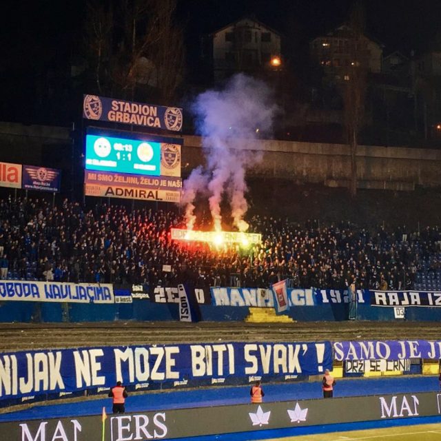 Sportlich lief der zweite Durchgang zur Freude der Fans erfolgreicher. Gegen den 2015 erstmals in die Premijer Liga aufgestiegenen Provinzclub (Gästefans gab es natürlich keine) wurde in der in der 57.Minute ausgeglichen. Mittelfeldspieler Mladen Veselinović brachte die Kurve zum Lodern und nach diesem Kopfballtor wurde sogar in unserer Nachbarschaft auf der Gegengerade gezündet. Schon geil; da sitzt jemand quasi allein, fiebert fleißig mit und beim Tor seiner Mannschaft springt er auf, holt seine Fackel aus der Jackentasche und entzündet sein Freudenfeuer. Das ist Fußball!