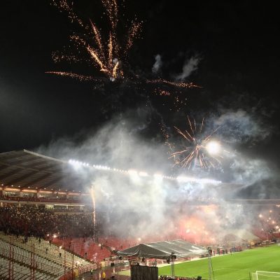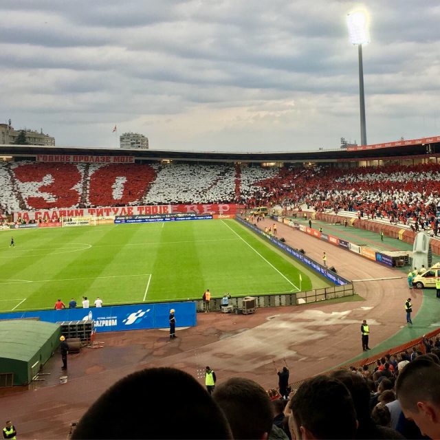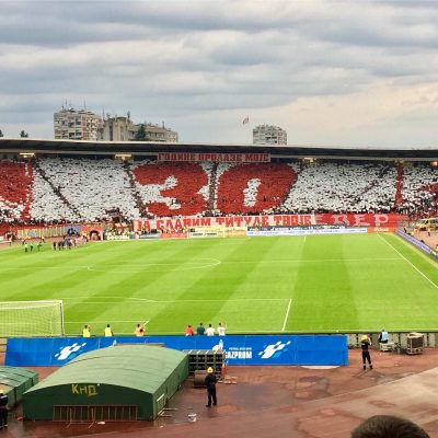 Gut gesättigt ging es nun weiter zum Stadion, wo wir vor’m Eingang noch einen Bekannten aus der Kurve trafen. Der erzählte ein bißchen über die geplante Choreographie und weitere interessante Dinge. Dann schieden wir nach dem Smalltalk zur Südkurve. Denn für alle anderen Bereiche waren die Eintrittskarten bereits vergriffen gewesen. Der Verein verlangte heute zwar keinen Eintritt, doch logischerweise mussten trotzdem auf die zugelassene Kapazität limitierte Freikarten gedruckt und ausgegeben werden. In jedem Fall würde es zur Feier des 30.Meistertitels und zum Höhepunkt der Feierlichkeiten des 30.Geburtstages der Hauptfangruppe Delije eine würdige Kulisse geben (seit Jahresanfang gab es bereits einige Jubiläumsaktionen der 1989 gegründeten Dachgruppe, doch heute sollte alles nochmal getoppt werden).