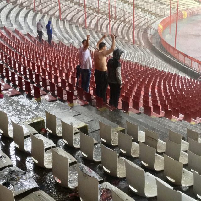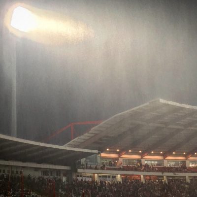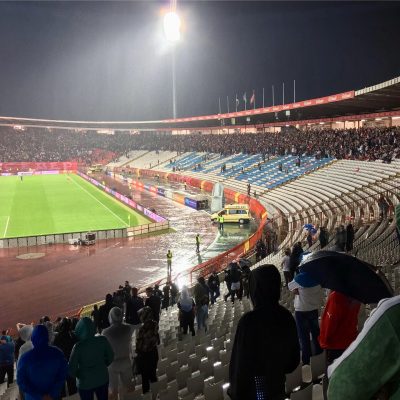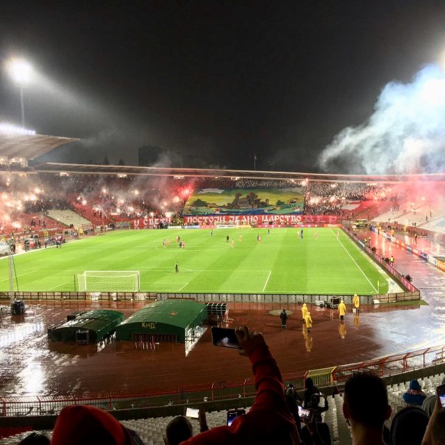 Während nun der Regen einsetzte, plätscherte auch das Spiel vorerst etwas vor sich hin. Zvezda behielt die Spielkontrolle, aber der Gast aus der zentralserbischen Stadt Kruševac verteidigte nun aufmerksamer und ließ weniger Torchancen als in der Anfangsviertelstunde zu. Nichtsdestotrotz wurde auf den Rängen munter weitergezündelt (es brannte heute eigentlich konstant 90+x Minuten im Belgrader Marakana).