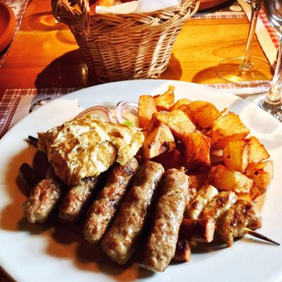 Wie gut, dass wir eh Hunger hatten und man in Vršac eines der besten Restaurants Serbiens finden kann. Im vielfach ausgezeichneten Etno Restaurant Dinar gönnten wir uns jeder eine Fleischplatte für umgerechnet 7 € und das Essen war wirklich ein Gedicht. Auf dem Teller befanden sich würzige Ćevapčići, ein Schweinefleischspieß (außen kross, innen saftig), eine pikante Grillwurst (erinnerte geschmacklich an Debrecziner) und ein Hähnchensteak, welches auch saftig daherkam. Dazu Kartoffeln nach Art des Hauses (in Knoblauchöl geröstet) und ein Brotkorb mit klassischem Hausbrot, sowie mariniertem Röstbrot. Ein bisschen Kajmak und Šopska wurde zur Sicherheit auch noch bestellt, aber die Fleischplatte nebst Beilagen war erwartungsgemäß ausreichend sättigend für jeden.