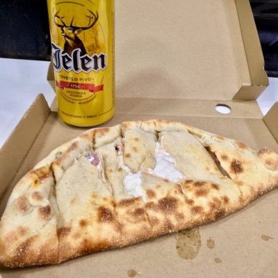 Als die Cola leer war und der Regen etwas nachließ, wagten wir den Aufbruch in die Stadt. Kaum zurück auf dem Gehsteig, sahen wir, dass im Nachbarlokal Contra Pab schon wieder Alkohol ausgeschenkt wurde. Somit endete unser Marsch in die Innenstadt vorläufig nach vier Metern. Bei Rakija und Pivo ließen wir den Wahnsinn rund um das heutige Fußballspiel nochmal sacken. Als das Lokal zur Geisterstunde schloss, gab es schließlich noch Pizza Calzone bei der nahen Niederlassung von Happy Pizza (umgerechnet 1,70 € pro Stück). Nach diesem Mitternachtssnack ließen wir uns für 500 Dinar (ca. 4,25 €) von einem Taxler zu unseren rund vier bis fünf Kilometer entfernten Unterkünften fahren.