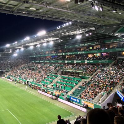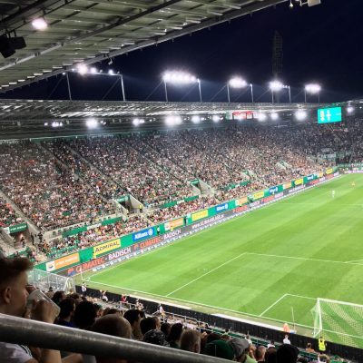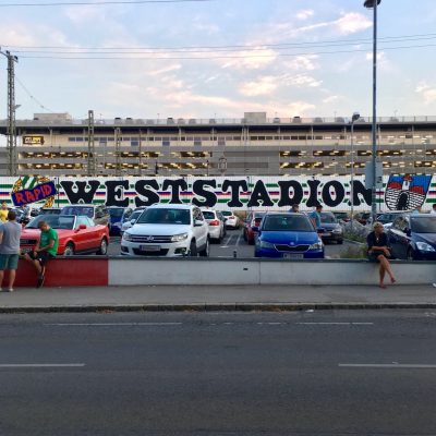 Unser heutiger historischer Stadtrundgang endete gegen 19:30 Uhr am Stephansdom. Nun ging es von hier via U-Bahn und S-Bahn raus nach Wien-Hütteldorf. Gegen 20 Uhr waren wir am Weststadion, welches 2016 das altehrwürdige Gerhard-Hannapi-Stadion von 1977 ersetzte und eigentlich den Namen eines Versicherungskonzerns trägt. Dieser Herr Hannapi war übrigens der Architekt des Stadions, doch zuvor auch Rapid-Spieler und außerdem viele Jahrzehnte Österreichs Rekordnationalspieler (bis ihn Toni Polster und Andreas Herzog übertrafen).