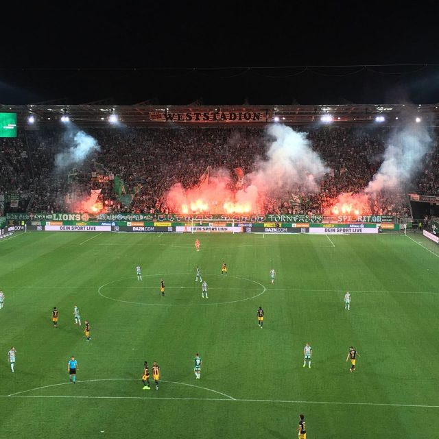 Seit 2014 hieß der Meister leider jedes Jahr FC Red Bull Salzburg. Die Sehnsucht diese Serie reißen zu lassen, postulierten die Rapid-Fans um die Ultras Rapid zu Spielbeginn mit einer Choreografie. „Der Teller gehört nach Hütteldorf“ war in deren Zentrum zu lesen und auf allen Tribünen gab es zustimmenden Applaus. Außerdem via Banner vor’m Block: „Erfolg ist uns Erbe und Gebot zugleich“. Umrahmt wurde dieser Ausspruch mit Abbildern der wichtigsten Trophäen, die Rapid in seiner 120jährigen Vereinsgeschichte errungen hat. Unter anderem auch die Deutsche Fußballmeisterschaft im Jahre 1941 und 32 Österreichische Meistertitel (der jüngste davon datiert allerdings aus dem Jahr 2008).