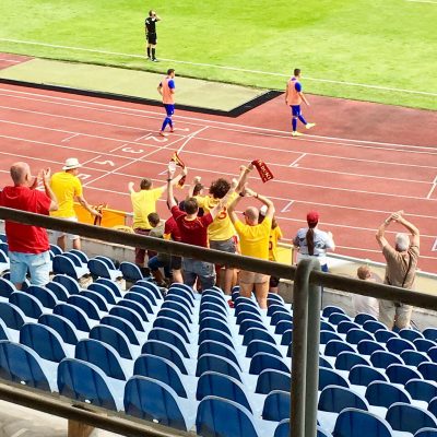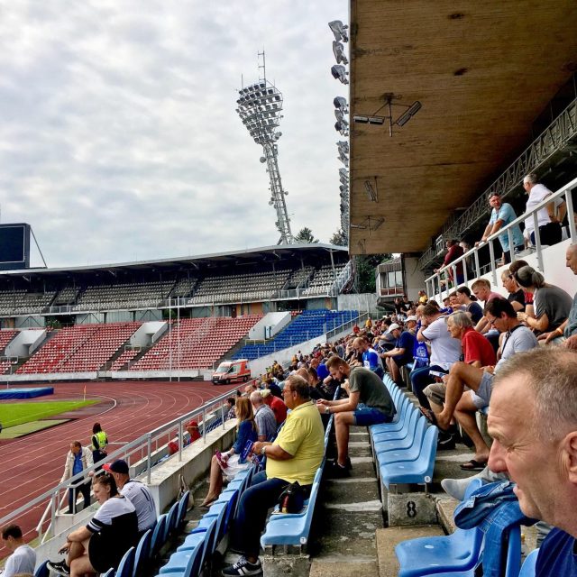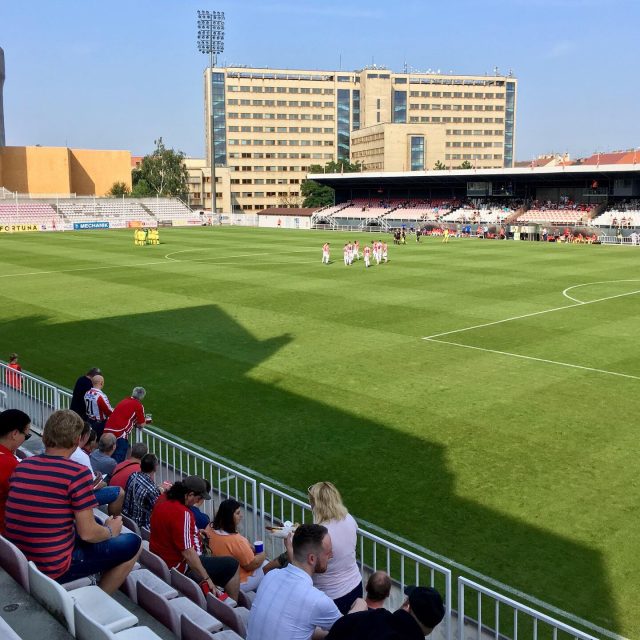 Jenes Žižkov war übrigens von 1881 bis 1922 eine eigenständige Stadt und ist nach Jan Žižka benannt (der bedeutendste Heerführer der Hussiten in den weiter oben erwähnten Hussitenkriegen des 15.Jahrhunderts). Aber Geschichte hatten wir schon ausreichend in diesem Bericht, widmen wir uns stattdessen lieber dem letzten Stadionbesuch der Reise. Denn Nik und LMS erwarteten mich bereits, verzichteten aber zunächst auf die von mir offerierte Geburtstagsrunde vom Grillrost. Stattdessen wurde eine recht flotte Partie Fußball – in einem optisch ausdrucksstarken Stadion (Eintrittspreis ca. 3,90€) – zunächst kulinarisch unbegleitet verfolgt.