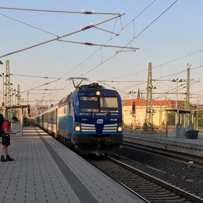 Am 23.August ging es direkt vom Büro zum Bahnhof und pünktlich um 14:37 Uhr rollte mein gebuchter InterCity der neueren Generation (Doppelstockwagen) ostwärts. Mein Umstiegsbahnhof Dresden-Neustadt wurde erfreulicherweise gemäß Fahrplan gegen 18:30 Uhr erreicht, so dass ich dort eine gute halbe Stunde Zeit zum Provianterwerb hatte. Kurz nach 19 Uhr begann die zweite und auch letzte Zugetappe, die mich binnen 144 Minuten von Dresden nach Prag transportierte. Dabei ging es zunächst lange durch die Sächsische Schweiz, u. a. vorbei am 2017 bestiegenen Lilienstein. Ich bin dieser Gegend sehr gewogen und im Zug kommt es einem irgendwie so vor, als führe man gerade durch eine Modelleisenbahnlandschaft.