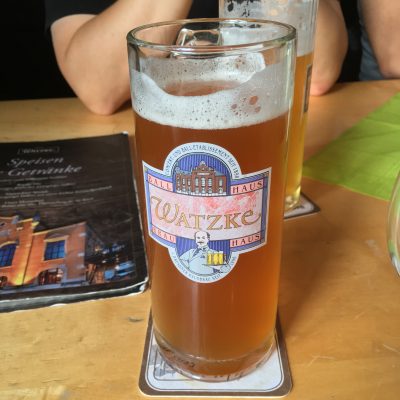 Am Abend hatten wir genug von Sightseeing und Stadtgeschichte und der körperliche Zustand ließ außerdem wieder eine neuerliche Alkoholisierung als bedenkenlos durchführbar erscheinen. Um Hunger und Bierdurst zu stillen, fuhren wir aus der Neustadt mit einem Taxi nach Mickten und ließen uns im Ball- und Brauhaus Watzke nieder. Passend zum letzten Absatz, kam das Lokal vor wenigen Jahren durch eine AfD- bzw.- JA-Veranstaltung mit Bernd, äh Björn Höcke als Hauptredner in Verruf. Wir wollen jetzt aber nicht groß zitieren, sondern nur „Denkmal der Schande“ als Stichwort erwähnen. Als der Faschopilgerei unverdächtigte Personen, ging es uns aber natürlich nur um das Essen (und natürlich auch um das Bier). Denn hier gibt es laut InterCityBerger die beste Haxe Deutschlands (und der Mann hat schon viele Haxen in seinem Leben gegessen!). Ich nahm aber im Gegensatz zu meinen Begleitern lieber erstmal nur etwas Kleines zu mir (der Körper hatte kurz zuvor noch Signale gesendet, dass ich es noch nicht übertreiben soll) und wurde von einem Steak au four auch satt.