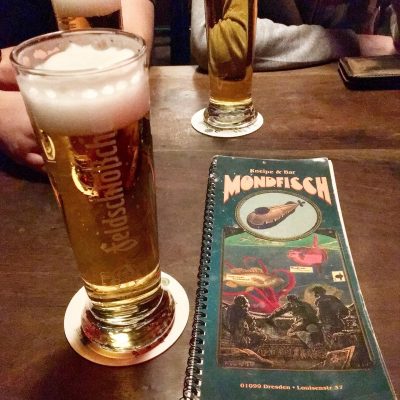 Zunächst einmal gab es Abendessen in Form einer Pizza im Imbiss Bonjorno (schreibt sich wirklich so). Da kosten alle Pizzen nur je 5 € und lecker sind sie obendrein. Jetzt waren wir reif für die hiesige Kneipenszene und begannen den großen Umtrunk im Little Creatures. Nette Bar, die den kleinen Helden der Unterhaltungsgeschichte an ihren Wänden huldigt (halt Figuren wie Mogwai, Willow, Meister Yoda, Alf oder Schlapperplapper) und eine gute Auswahl auf der Getränkekarte bietet. Wir stiegen mit Pilsner Urquell ins Fassbiergeschäft ein und zogen nach ein paar Runden weiter in den Mondfisch. Dort gönnten wir uns fassfrisches Dresdner Feldschlößchen. Der Crawl führte uns anschließend ins Madness. Die Pinte war Berger und mir bereits vom vorigen gemeinsamen Dresdenbesuch bekannt und feiert optisch größtenteils die britische Popkultur an seinen Wänden (u. a. Filme wie Quadrophenia oder Trainspotting). Hier wurde uns tschechisches Lagerbier als süffiges Hausbier zum schmalen Preis serviert.