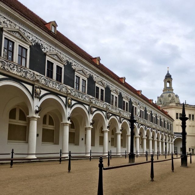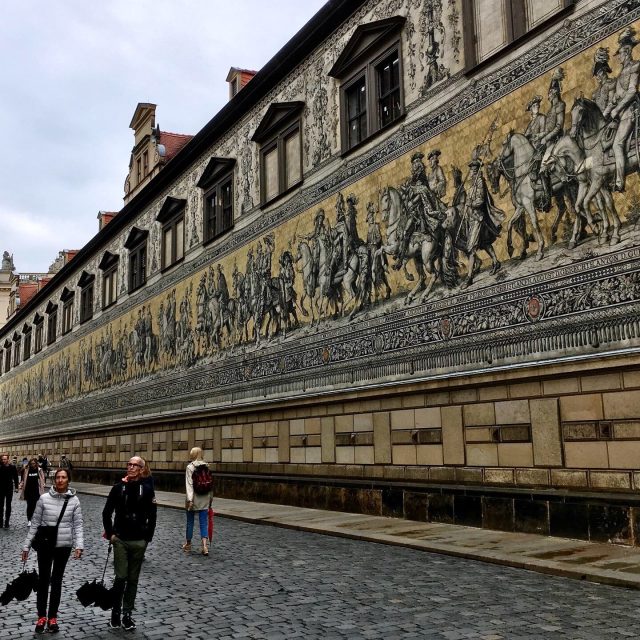 Im historischen Kern Dresdens beschäftigten wir uns nun ausgiebig mit der Stadtgeschichte und den stummen Zeitzeugen. Ein guter Einstieg war natürlich der Dresdner Fürstenzug. Auf rund 23.000 Meißener Porzellankacheln werden dort seit 1907 insgesamt 34 über Sachsen herrschende Markgrafen, Herzöge, Kurfürsten und Könige aus dem Geschlecht der Wettiner gewürdigt. Konrad der Große (1127 bis 1156 Markgraf von Meißen) ist der erste und Georg von Sachsen (1902 bis 1904) der letzte dargestellte Herrscher des Reiterzuges. Beim Abschreiten des 102 Meter langen Wandbildes stolperten wir über manchen kuriosen Namen bzw. Beinamen. Dietrich der Bedrängte (1198 bis 1221 Markgraf von Meißen), Albert der Entartete (1288 – 1307) oder Friedrich der Gebissene (1292 – 1323) weckten auf jeden Fall unser Interesse an einer Auseinandersetzung mit ihren Biografien.
