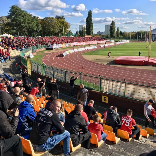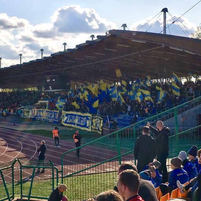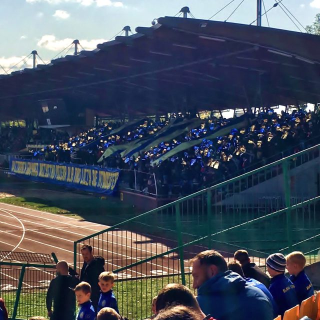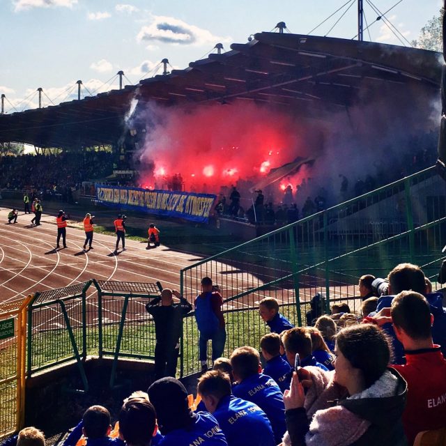 Leider gab es außer dem einheitlichen Auftritt der Gästefans in Rot, den landestypisch schicken Zaunfahnen und einer Schalparade keine großartigen optischen Akzente von Widzew. Dafür boten sie den gewohnt lauten Support einer der besten Fankurven des Landes, während Gastgeber Elana seinerseits für das große Spiel ein paar choreographische Elemente vorbereitet hatte. Nach einer Viertelstunde Spielzeit gab es Stoffbahnen in den Clubfarben und Glitzertafeln auf der Haupttribüne zu bewundern (auf welcher sich der Fanblock befindet). In der Mittagssonne leider nicht so gut zu fotografieren und die auf die Choreo folgenden Bengalischen Feuer kamen ebenfalls nicht so geil zur Geltung, wie es zu einer späteren Anstoßzeit der Fall gewesen wäre. Nichtsdestotrotz freut man sich als Gast, der – Überraschung! – nicht primär wegen der fußballerischen Qualität der polnischen 3.Liga angereist ist, natürlich über solche Aktionen.