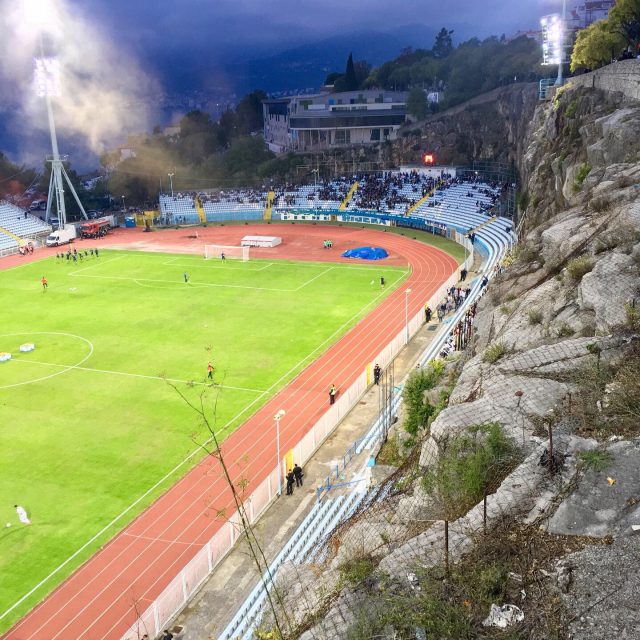 Ich ließ mich oberhalb der Spielstätte rauswerfen und überblickte zunächst das malerisch am Fuße der Klippen der Kvarner Bucht gelegene Stadion. Aber Bilder sagen bekanntlich mehr als 1000 Worte…