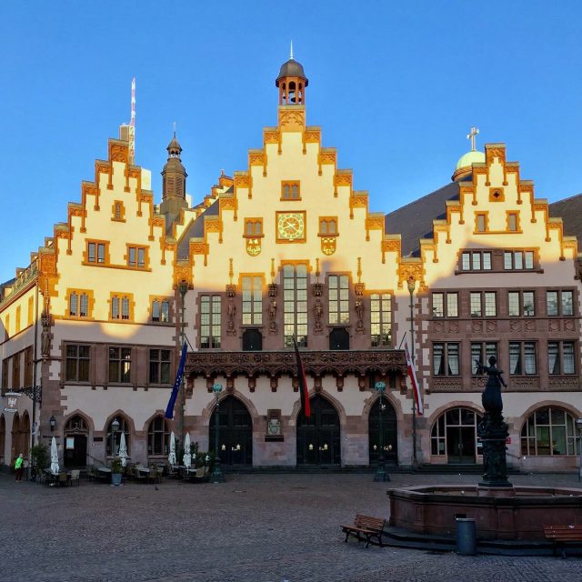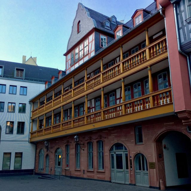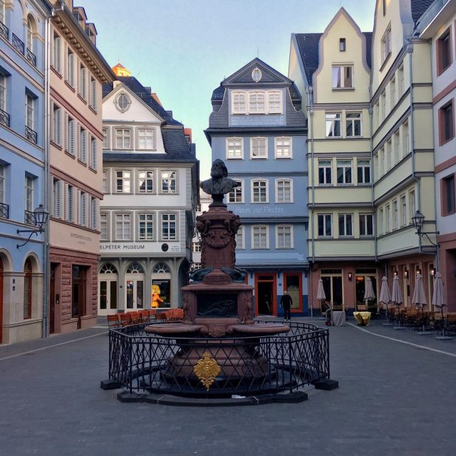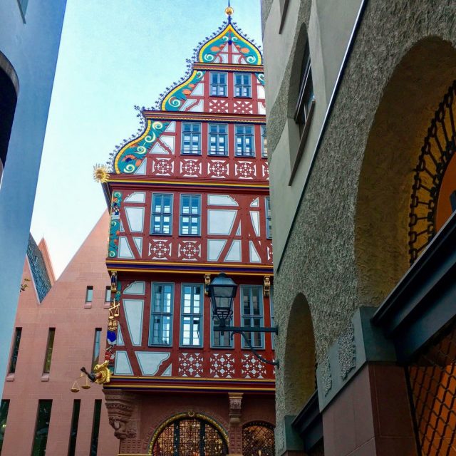 Da ich pünktlich in Frankfurt ankam (7:44 Uhr), benötigte ich meinen rund 96minütigen Zeitpuffer nicht und spazierte vom Hauptbahnhof zum Römer. Die viel beachtete Neue Altstadt wollte ich mir mal live anschauen. Sie wurde letztes Jahr nach sechs Jahren Bauzeit eröffnet und kostete rund 200 Millionen Euro. 35 historische Gebäude wurden zwischen Römer und Dom rekonstruiert, um ein Stück des alten Frankfurts wiederauferstehen zu lassen. Immerhin bis zum Zweiten Weltkrieg eine der größten und schönsten Altstädte Deutschlands. Die Neubauten, für die das brutalistische Technische Rathaus der Stadt Frankfurt weichen musste, machen einen netten Eindruck. Allerdings fehlt es ihnen an Patina, so dass man sich (noch) in einer Art Filmkulisse wähnt.