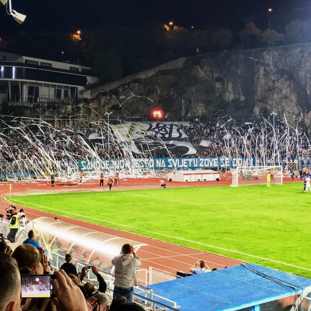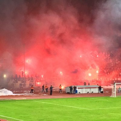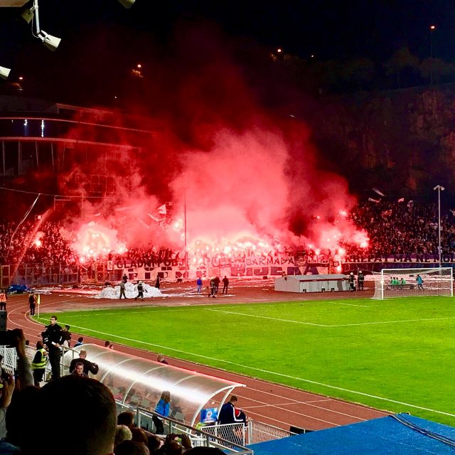 Aber warum auch nicht? Schließlich war die baldige Pyroshow der Heimkurve ganz großes Kino! Zwischen der 55. und 65.Spielminute fackelte die 1987 gegründete Armada Rijeka etliche Bengalos ab. Ging irgendwo eins aus, leuchte anderswo wieder eins auf. Wie gesagt, so circa 10 Minuten loderte die Kurve und natürlich gab es dazu brachial laute Gesänge.