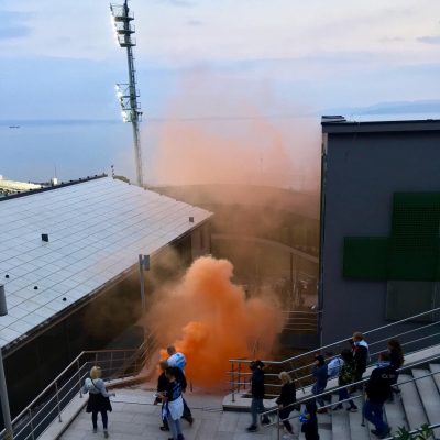 Es war gut was los und die Fans sangen schon beim Anmarsch zum Stadion ihre Lieder. Rauchtöpfe auf den Zuwegen, wie auch Leuchtraketen am Abendhimmel waren bereits zu bewundern. Über Serpentinen schlängelte ich mich hinunter zur Adria, wo sich viele Fans anscheinend heute zunächst einen schönen Strandtag gemacht hatten. Außerdem war hinter der Haupttribüne eine Bühne aufgebaut und eine Band spielte Gassenhauer vor feiernden Fanscharen. Die Ultras der Armada Rijeka, die heute der offizielle Veranstalter waren, hatten sich einiges einfallen lassen.