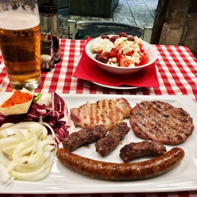 Da unter den ca. 111 deutschen Hoppern am heutigen Abend auch zwei Bekannte von mir weilten, war ich in der Stadtzentrum noch mit CTM und Schüßler zum Abendessen verabredet. Wählerisch war ich nicht und schaffte mit dem Conca d’oro neben meiner Unterkunft Tatsachen, noch bevor das Duo eintraf. Für mich gab es die kleine Grillplatte für 85 Kuna, einen Šopska für 25 Kuna und ein großes Bier für ebenfalls 25 Kuna. Geschmacklich Durchschnitt („Not great, not terrible“, würde Anatoli Djatlov sagen) und etwas überpreist, doch den Umständen entsprechend befriedigend. Nach dem Essen zog meine temporäre Gesellschaft noch los, um die Kneipenszene zu prüfen. Doch während sie Sonntag erst um 17:30 Uhr abreisen mussten (übrigens mit BlaBlaCar für 29 € p. P. von Rijeka nach München), klingelte mein Wecker bereits um 6:30 Uhr. Daher ging ich kurz vor Mitternacht nebenan zu Bette.
