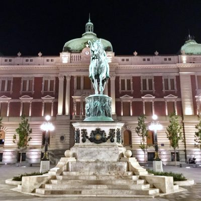 Anschließend betrieben wir doch noch etwas Sightseeing. Obwohl es schon dunkel war und weiterhin regnete. Auf mein mittlerweile etabliertes Format einer kurzen Reise in die Stadtgeschichte verzichte ich aber an dieser Stelle (mit dem Juli-Bericht 2019 habe ich diesbezüglich meine Schuldigkeit getan). Allerdings durfte Marc meinen verbalen Ausführungen lauschen, während wir vom Trg republike über die Knez Mihailova zur Festung spazierten. Belgrade by night ist natürlich auch schön und Kollege Marc würde Donnerstag und Freitag noch Gelegenheit haben, um die Stadt bei Tageslicht und wohl bei besserem Wetter zu bewundern.