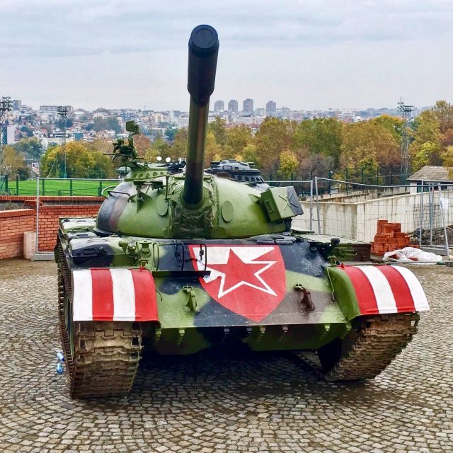 Nach Abpfiff ging es zeitnah raus dem Belgrader Marakana und rein ins Verkehrsgetümmel. Gegen 23:30 Uhr hatte ich mein Hotel erreicht und diesmal stellte ich den Wecker auf 8 Uhr. Ich würde gegen 12 Uhr zum Flughafen aufbrechen müssen und wollte noch ein bisschen von dem halben Tag in Belgrad haben. Ergo hieß es am nächsten Morgen Duschen, Frühstücken, Marc auflesen, Taxi schnappen und nochmal ab zum Stadion Rajko Mitić. Der schon jetzt berühmt berüchtigte Panzer vor der Nordkurve musste endlich mal geknipst werden. Dieser T-55 in Crvena-zvezda-Sonderlackierung wurde im August vor dem entscheidenden CL-Playoff-Spiel gegen die Young Boys aus Bern aufgestellt. Unbestätigten Gerüchte zufolge war der Kampfpanzer aus sowjetischer Produktion dereinst in der Schlacht um Vukovar im Einsatz (1991 im Kroatienkrieg), was in Kroatien ein empörtes Echo auslöste. Die UEFA kommentierte übrigens sehr lapidar: „Der Panzer vor dem Stadion ist kein Problem, solange nicht damit geschossen wird.“