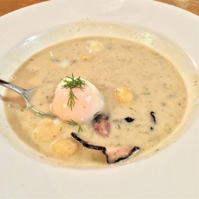 Da das Frühstück mittlerweile schon über zwölf Stunden her war, hatte ich nach meinem Bunkerrundgang ein aufgekommenes Hungergefühl zu stillen. Unweit des Bunkers fand ich das sehr belebte Restaurant Stopkova Plzeňská Pivnice, in dem nur noch wenige Plätze frei waren. Zum Glück gab es im Obergeschoss noch ein kleines Tischchen für einen hungrigen Mann. Der grenzenlos wirkende Appetit wurde zunächst mit einer Kulajda gestillt. Das ist eine süß-saure Suppe mit Dill, Kartoffeln, Schinkenspeck und einem pouchierten Ei. Leckere Angelegenheit, die zusammen mit dem ersten Krug Bier schon mal das Magenknurren beseitigte.