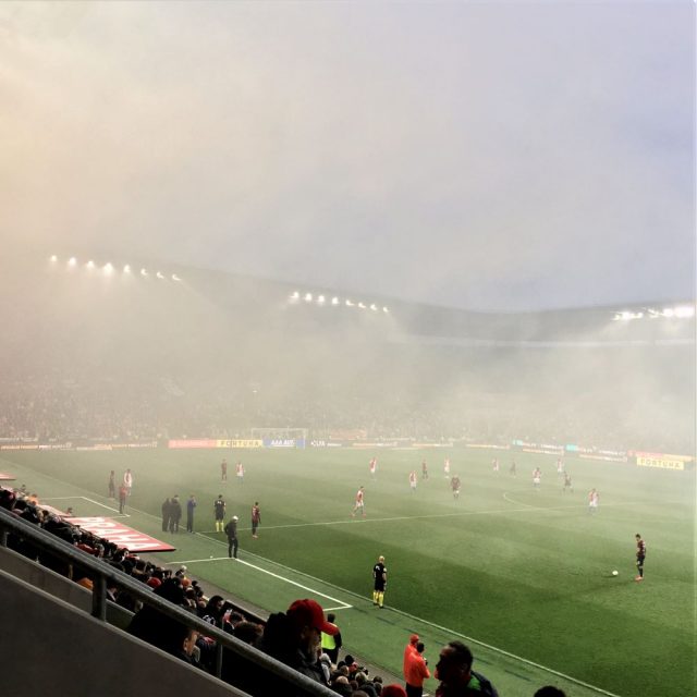 Weil sich der Virus offenbar über Rauchwolken ausbreitet (so genannte Partikelinfektion), gab es in der 2.Halbzeit natürlich auch einen Ausbruch im Gästesektor. Obwohl sich die Ultras von Sparta extra Schutzanzüge angezogen hatten und Schutzmasken trugen, war eine Ausbreitung des Virus im ganzen Block nicht mehr zu verhindern. Überall leuchtete und loderte es in Südostecke des Stadions. Nach wenigen Minuten klangen die Symptome aber wieder ab. Mein Fazit nach langjähriger Feldforschung: Der Pyrovirus ist zwar unter Umständen gesundheitsgefährdend, aber in der Regel verläuft alles schadlos und die Symptome klingen meistens schneller ab, als sie aufgetaucht sind. Deutlich mehr Dance als Hammer ist meine Empfehlung.