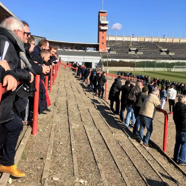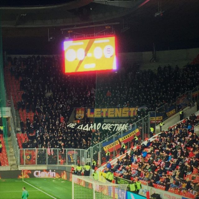 Außerdem fiel Spartas Anhang noch mit einem Spruchband auf serbisch auf. „Ne damo svetinje“ (zu deutsch: Wir geben unsere Heiligtümer nicht her) war in kyrillischen Lettern zu lesen. Damit sollte Unterstützung für die Serben, respektive die serbisch-orthodoxe Kirche in Montenegro ausgedrückt werden. Der Montenegro seit 30 Jahren in verschiedenen Funktionen beherrschende Kleptokrat Milo Djukanovic hatte Ende letzten Jahres ein umstrittenes Religionsgesetz durchgeboxt, welches ermöglicht die serbisch-orthodoxe Kirche (der ca. 70 % der Einwohner des Landes angehören) weitgehend zu enteignen. Dagegen gehen seit Monaten zweimal wöchentlich zehntausende Montenegriner dezentral auf die Straße, was bei nur 600.000 Einwohner im gesamten Staat eine bemerkenswerte Zahl ist. Offenbar möchte sich Spartas Fanszene mit diesen Protesten, bei den es natürlich um noch viel mehr als religiöse Fragen geht, solidarisieren.