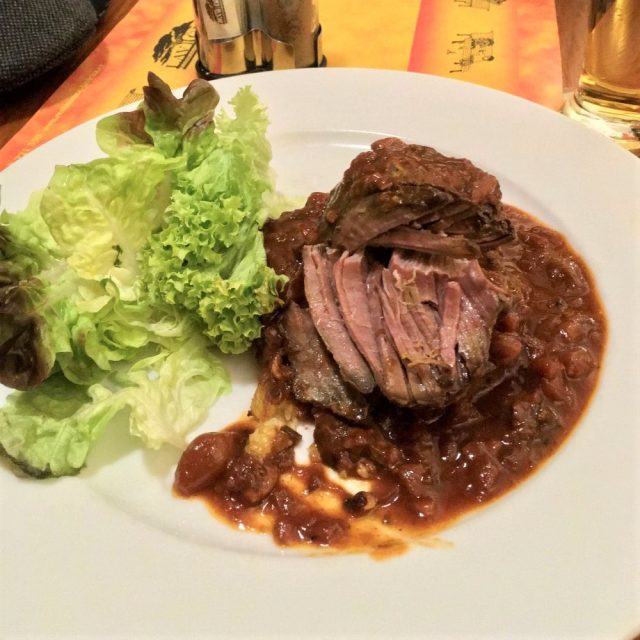 Doch bis hierhin lief es ganz gut und meine letzten 300 CZK wollte ich jetzt noch in eine weitere Gastwirtschaft stecken. Nahe des Hotels fand ich das Lavička, wo ich mir ein großes Stück Rinderbraten auf Kartoffelstampf mit Rotweinsauce gönnte (perfekt für ’nen Sonntag). Dazu noch eine böhmische Bierspezialität vom Fass (Bernard 12° ungefiltert) und ich war mit Trinkgeld tatsächlich meine 300 CZK los (ca. 11,50 €). Gegen 21 Uhr ging es zufrieden zu Bette und am nächsten Morgen war ich entsprechend auch ohne Wecker schon gegen 7 Uhr wach.