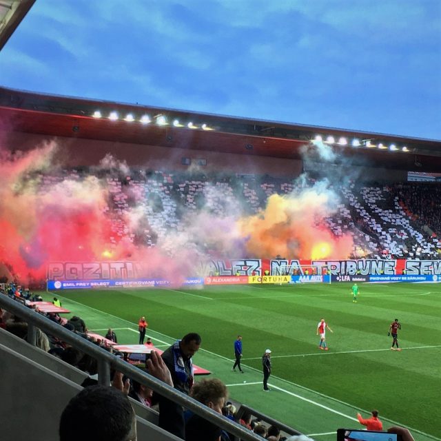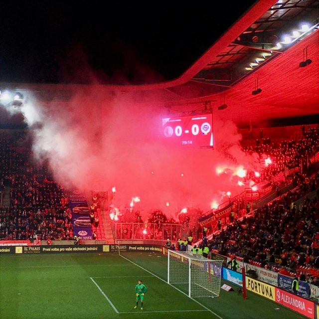 Nun brodelte der Hexenkessel in Praha-Vršovice nochmal richtig. Pure Ekstase bei den Sešivani (zu deutsch die Zusammengenähten, aufgrund der traditionell rot und weiß geteilten Trikots). Der späte Ausgleich fühlte sich wie ein Sieg an und entsprechend tickten die letzten Sekunden des Spiels im Fackelschein der Freudenfeuer herunter. Ein tolles Derby endete also ähnlich stimmungsvoll, wie es begonnen hatte. Ich hatte schon so eine Ahnung, dass das auf lange Sicht mein letzter Stadionbesuch gewesen könnte (das heutige Derby stand gesundheitsbehördlich auch schon auf der Kippe) und verließ das Stadion mit einem lachenden und einem weinenden Auge.