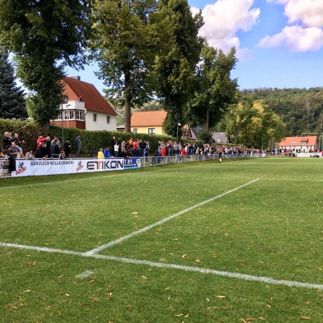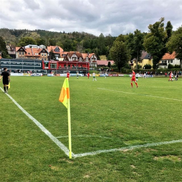 Rund 35 Minuten vor Anpfiff verließ ich die Altstadt durch das Westerntor und konnte ab dort nett an den Gleisen der Harzer Schmalspurbahn entlang spazieren. Das erlaubte nicht nur Trainspotting, sondern führte auch zielsicher in den Ortsteil Hasserode (Bierfreunden sicher ein Begriff). Vom Timing wurde es beinahe ’ne Punktlandung. Exakt 14 Uhr erreichte ich das Sportareal. Da die Schlange am Eingang jedoch recht lang war, verpasste ich allerdings das erste Tor des Tages. Der Platzhirsch FC Einheit Wernigerode gegen den FC Grün-Weiß Piesteritz früh in Führung gegangen (3. Minute).