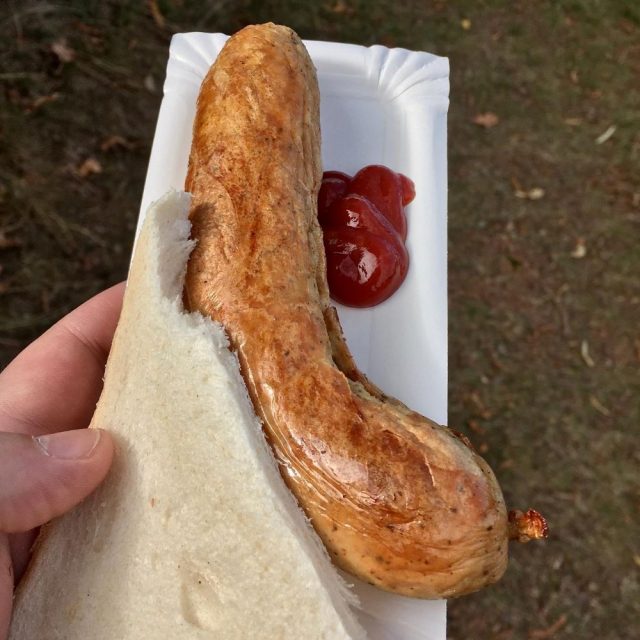 Jene Pause nutzte ich für einen Gang zum Kiosk und erwarb eine Bockwurst mit Senf und ein Mineralwasser für zusammen 3 € (zuzüglich 0,50 € Becherpfand). Einen Grill schien es leider nicht zu geben. Nirgendwo waren Rauchschwaden auszumachen. Nach dem Pausensnack rollte der Ball auch schon wieder und der FC Einheit ließ erneut diverse Torchancen aus. Doch just nachdem ich vor dem Funktionsgebäude beim Stadionrundgang tatsächlich noch einen (Gas)Grill entdeckte und mir für 2 € eine mittelmäßige Bratwurst gönnte, gelang den Hausherren in der 65. Minute durch Niclas Eheleben endlich das 2:0. Fünf Minuten später machte Nikita Brölin, nach Vorarbeit von Eheleben, den Sack zu. Die Grün-Weißen würden nun gewiss punktlos ihre Rückreise in die Lutherstadt Wittenberg antreten.
