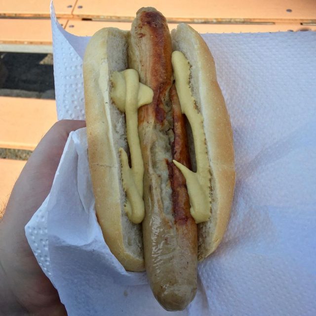 Heute wurden 197 zahlende Zuschauer vermeldet, die sich hauptsächlich auf der schönen Hauptgeraden des Stadions platziert hatten. Ich beschloss mir erstmal eine Erfrischung in Form von Mineralwasser (1 €) und einen kleinen Snack in Gestalt einer Bratwurst (2 €) zu organisieren. Die Bratwurst war Thüringer Art mit ordentlich Kümmel, allerdings geschmacklich eher mäßig (wahrscheinlich industrielle Massenware). Der Bautzner Senf half ein wenig beim Geschmackserlebnis nach.
