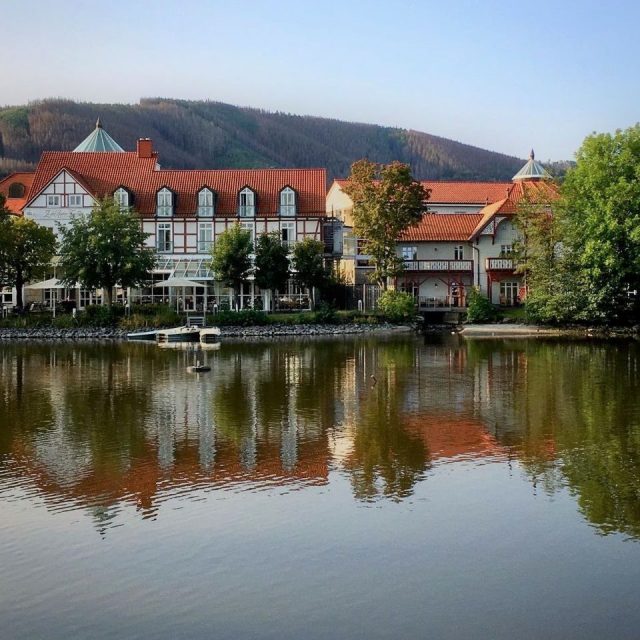 Um 8:28 Uhr erreichte ich Ilsenburg (250 Meter ü. NN) und steuerte zunächst den Marktplatz der Kleinstadt an (mit den Ortsteilen Drübeck und Darlingerode zusammen ca. 9.600 Einwohner). Dabei passierte ich den Kitzsteinteich, der mir ein erstes schönes Panorama mit Brockenblick schenkte. Auch kam ich an der Faktorei des alten Stahlwerks vorbei und umrundete einmal den ebenfalls netten Forellenteich im Ortskern. Neben den fachwerkgesäumten Straßenzügen, waren Schloss und Kloster Ilsenburg mein erstes Etappenziel. Bei diesem morgendlichen Spaziergang merkte ich der Stadt sofort ihre reiche Historie an.