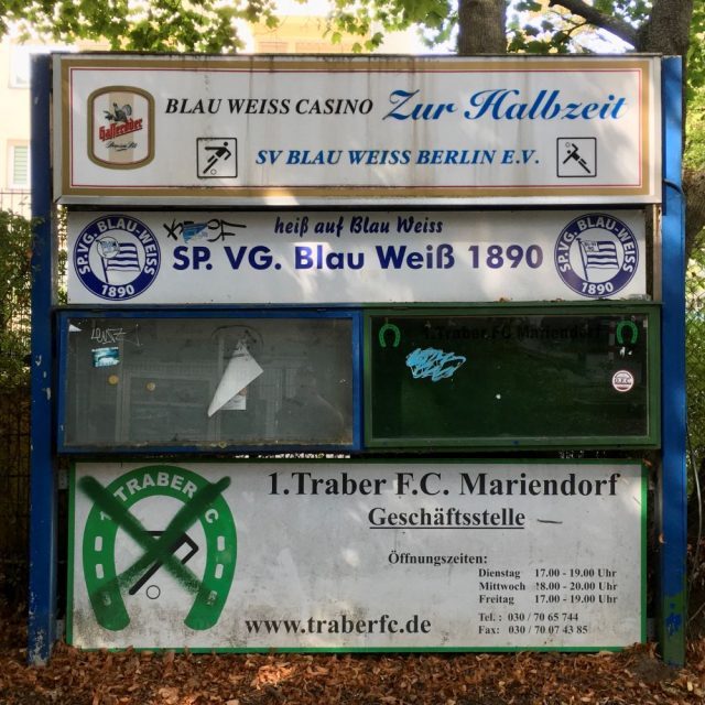 Aktuell tritt die 1. Mannschaft der Blau-Weißen in der NOFV-Oberliga Nord (5. Liga) im Volksparkstadion Mariendorf an. Die Rathausstraße beherbergt seit 1966 aber nach wie vor das Clubhaus von Blau-Weiß 90 und diverse Mannschaften des Vereins tragen hier weiterhin ihre Pflichtspiele aus (u. a. die 2. Herren). Das Areal teilt man sich mit dem 1. Traber FC Mariendorf von 1962, der heute mein Gastgeber war. Die Traber kommen ursprünglich von der Trabrennbahn Mariendorf und waren von 1979 bis 1990 konstant in der Oberliga Berlin unterwegs (damals 3. Liga im DFB-System). Beste Platzierung war 1985/86 ein zweiter Platz, womit man die Teilnahme an der Aufstiegsrunde zur 2. Bundesliga nur knapp verfehlte. Ab 1990 ging es jedoch sportlich bergab und seit 2014 ist man nur neuntklassig unterwegs (Kreisliga A).