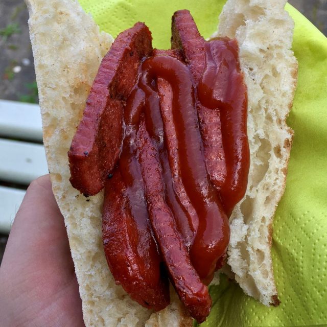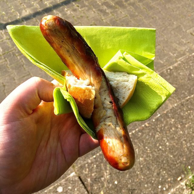 Von dort waren es nur noch gute 500 Meter zum Sportplatz an der Rathausstraße und 14:31 Uhr passierte ich das weit offen stehende Eingangstor. Eintritt wurde nicht erhoben, Daten wurden ergo ebenfalls nicht erfasst. Nach der unerwarteten Ersparnis ließ ich um so lieber vier Taler am Imbissstand, welcher heute vom Vereinsvorstand des 1. Traber FC bewirtet wurde („Hier grillt der Präsident noch persönlich“). Für mein Geld wurde mir leckere gegrillte Sucuk im Fladenbrot und ein großer Becher Cola gereicht (je 2 €). Auch die Bratwurst (ebenso 2 €) sah appetitlich aus und wurde zur 2. Halbzeit noch nachträglich getestet. Der Geschmack konnte mit der Optik erfreulicherweise Schritt halten.