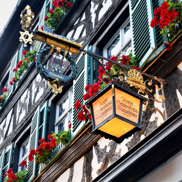 Die Bamberger Bierspezialität bekommt ihren rauchigen Geschmack übrigens durch die Trocknung des Malzes über offenem Feuer. Eine traditionelle Methode, die früher – sofern Lufttrocknung nicht möglich war – üblich war, aber technisch durch gas- oder ölbefeuerte Heizanlagen überholt wurde. Doch im Schlenkerla hält man an der rauchigen Tradition bis heute fest. Angeblich soll man nach dem allerersten Rauchbier sofort ein, zwei weitere Krüge ordern und wird dann doch noch Fan. Aber wir hielten das für einen billigen Marketingtrick und stiegen lieber auf Kräusen um. Schmeckte uns deutlich besser.