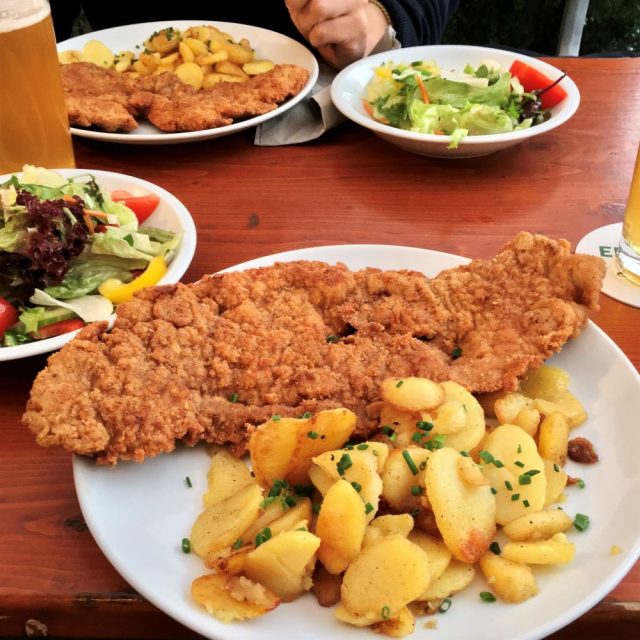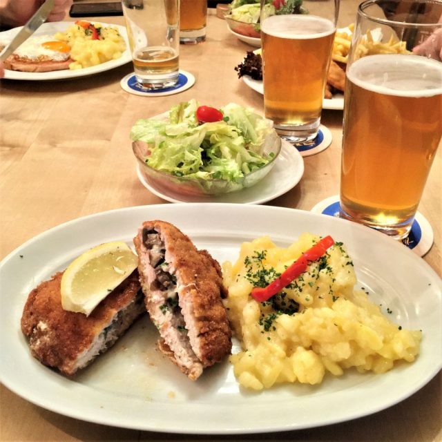 Dass die Bergsteigerschnitzel hier vorzüglich schmeckten, rundete den Besuch nochmal ab. Die Schnitzel waren mit Käse, Kräutern und Egerlingen gefüllt und kamen in Begleitung von Blattsalat und Kartoffelsalat (13 €). Weil es zwischenzeitlich tatsächlich kräftig regnete, wurden es insgesamt drei Seidla pro Kopf im Greifenklau und der nächste geplante Stopp, der Biergarten der Brauerei Spezial auf dem Stephansberg, fiel aus.