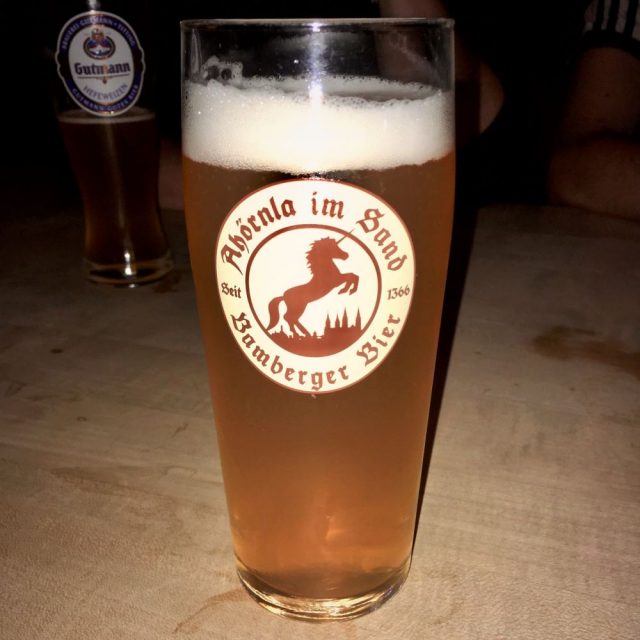 Nach den zwei Seidla (so nennen die Franken ihre Halblitergebinde) im Schlenkerla wollten wir das nächste Wirtshaus ansteuern. Die Gaststuben in der direkten Nachbarschaft, wie z. B. das Ambräusianum, waren jedoch bis auf den letzten Sitzplatz ausgelastet. Letztlich bekamen wir noch einen Tisch im Ahörnla im Sand. Auch diese Gaststube beruft sich auf mittelalterliche Tradition. Bereits 1366 wurde das Gebäude erstmals als Putnerhaus zum Eychhorn schriftlich erwähnt. Seitdem war es fast immer im Besitz von Putnern (Fassbindern) oder Brauern. 1450 ist erstmals eine Gastwirtschaft urkundlich belegt.