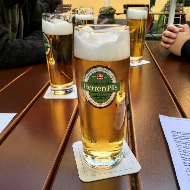 Natürlich musste auch noch eine Runde Bier aus der Burgschänke entführt werden. In Bambergs höchstem Biergarten genossen wir jeder ein Seidla von Weyermanns Lager hell (Weyermann ist eigentlich eine große Mälzerei in Bamberg, die aber auch nebenbei eigene Biere braut). Mit dem letzten Schluck des Lagerbieres konnten wir übrigens auf den just errungenen Derbysieg von Hannover 96 anstoßen (4:1 gegen Eintracht Braunschweig). Der ein oder andere Wettschein ging dadurch auf.