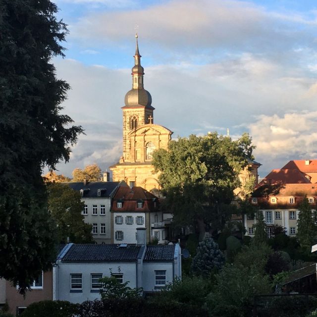 Nach der Begutachtung des Rathauses, ging es runter ans Ufer der Regnitz und wir genossen das Panorama der gegenüberliegenden Häuserzeilen. Jene Fischerhäuser aus dem 17.Jahrhundert nennt man passenderweise Klein Venedig. Anschließend streiften wir auf unserer Tour den Bamberger Dom und die Neue Residenz und dann ging es auf dem Benediktinerweg hinauf zum Kloster Michaelsberg. Von den umliegenden Michaelsberger Gärten hatten wir dabei nochmal einen exponierten Ausblick über die Regnitz und die Altstadt.