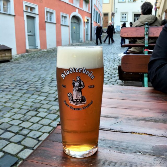 Stattdessen spazierten wir auf 18 Uhr direkt zu Klosterbräu an der Oberen Mühlbrücke. Dabei handelt es sich angeblich um die älteste Brauerei der Stadt. Sie wurde 1533 als Fürstbischöfliches Braunes Bierhaus gegründet. Weil die Braustätte jedoch schon 1333 erstmals urkundlich erwähnt wurde, darf man den begehrten Titel Älteste Brauerei Bambergs tragen. Im Klosterbräu, dessen Name auf das benachbarte Franziskanerkloster zurückgeht, gibt es als Spezialität untergäriges Braunbier, welches wir uns auf der Terrasse schmecken ließen. Drinnen gab es derweil ohne Reservierung keine Chance auf einen Platz. Das wird an diesem Samstagabend mutmaßlich in allen Brau- und Gaststuben der Altstadt so gewesen sein.