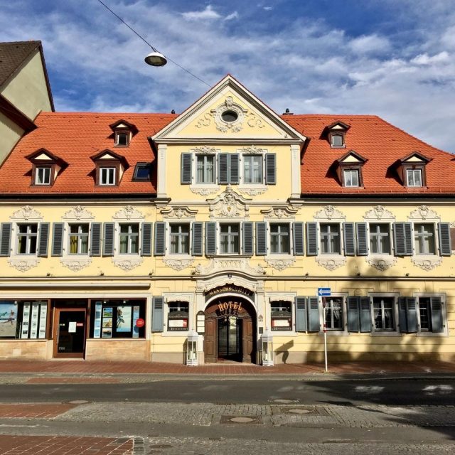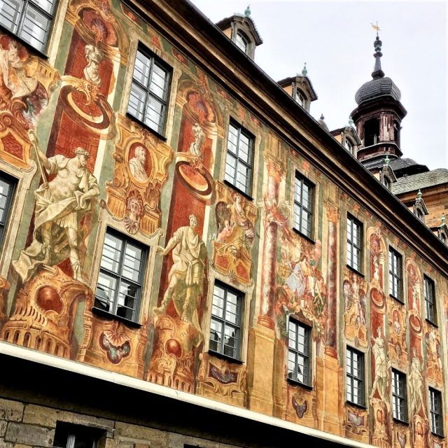 Der erstbeste Palazzo von Venezia franconia, das Residenzschloss Geyerswörth, war zwar leider eingerüstet, aber dafür präsentierte sich das Alte Rathaus in voller Pracht (siehe Titelbild). Es wird beidseitig von der Regnitz umspült und ist über zwei Brücken mit der Altstadt verbunden. Das imposante Bauwerk wurde im Wesentlichen zwischen 1461 und 1467 errichtet und ersetzte einen mittelalterlichen Vorgängerbau. Das eigentlich gotische Rathaus wurde dann im 18.Jahrhundert nochmal barockisiert und bekam dabei u. a. erstmals seine schönen Fassadenmalereien.