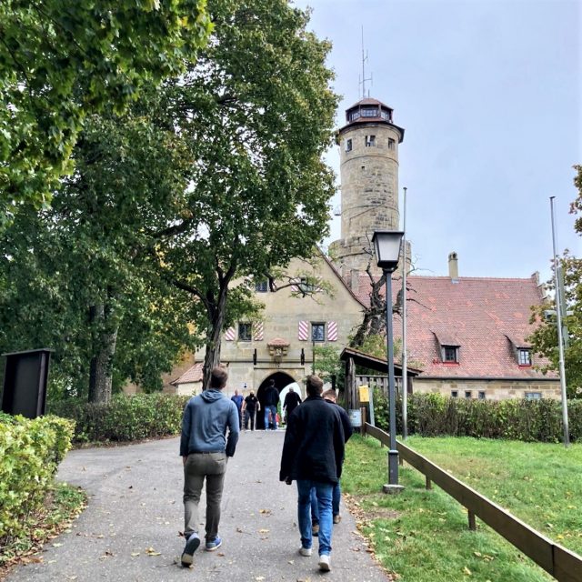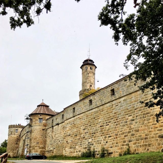 Am Ziel, auf 386 Metern ü. NN, hatte man einen schönen Ausblick auf Bamberg. Außerdem schauten wir uns die im frühen 12.Jahrhundert erbaute Altenburg mal genauer an. Zwischen 1305 und 1553 war diese Burg Residenz der Bamberger Fürstbischöfe. Später fand unter anderem der Romantiker E. T. A. Hoffmann in einem der Türme sein Refugium. Das erinnerte mich daran, wie ich Hoffmanns Sandmann in der 12.Klasse erst während der Klausur las und trotzdem 11 Punkte auf meine Arbeit bekam. Die Strategie empfehle ich der heutigen Schülergeneration jedoch nur bei besonders kurzen Werken (Der Sandmann umfasst nur etwa 60 Reclamseiten).