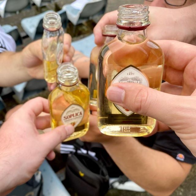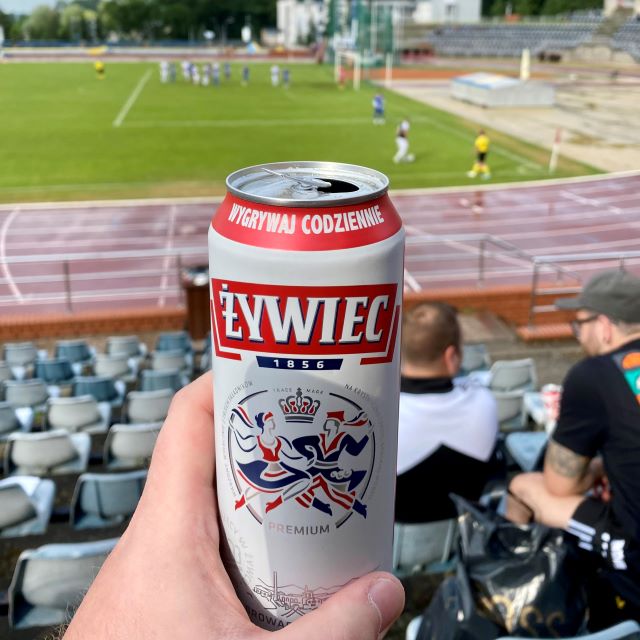 Ebenfalls leer bleiben sollte die Stadionkasse, da Polonia keinen Eintritt erhob. Da lachte das Hopperherz. Dafür gab landes- und ligatypisch leider kein Catering in Polens 5.Liga. Dabei hätten wir mangels fester Nahrung im bisherigen Tagesverlauf garantiert versucht einen Kiełbasa-Rekord aufzustellen. Stattdessen verließ der Abt kurz vor Anpfiff nochmal das Stadion und organisierte auf dem nahen Polenmarkt Bier und Schnaps für die Bande. Das gab neidische Blicke der ca. 30 anwesenden deutschen Groundhopper, während wir unsere polnischen Sitznachbarn auf eine Runde einluden.