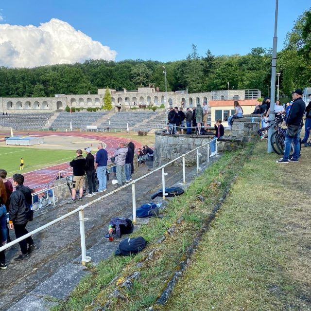 Übrigens hatte sich auch auf Heimseite ein Teenagermob gebildet, der seine Mannschaft lautstark unterstützte. Das war alles nichts Weltbewegendes, jedoch mehr als wir erwartet hatten. Dazu zählt das Stadion wirklich zu den Perlen Polens. Bereits 1914 wurde begonnen das Stadion an der Kleisthöhe zu bauen. Es wurde endgültig im Jahre 1927 fertiggestellt (Erster Weltkrieg und folgende Wirtschaftskrise verhinderten eine zeitnahe Eröffnung) und ist ein tolles Beispiel für die Stadionarchitektur des frühen 20.Jahrhunderts. Damals wurde sich sehr an antiken Vorbildern orientiert und das ist in Słubice besonders in der Kurve mit ihren Kalksteinarkaden zu erkennen.
