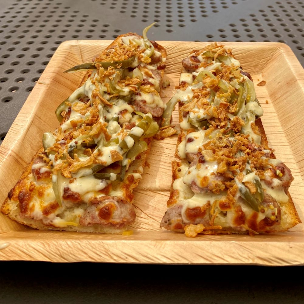 Łódź hatte den Vorteil, dass ich hier schon zweimal zu Gast war und mehr oder weniger alles in der Innenstadt gesehen hatte (wer mehr über Łódź erfahren will, kann sich mit den Berichten Łódź 05/2018 und Łódź 07/2018 vergnügen). So herrschte an diesem Wochenende kein touristischer Druck und ich spazierte lediglich gemütlich die Piotrkowska entlang (die Prachtstraße von Łódź). Dann lockte ein Sommerbiergarten in einem der Innenhöfe. Dort gab es einen alkoholfreien Melonencocktail (ca. 3,50 €) zur Erfrischung und als Mittagessen ein Zapiekanka mit Biała Kiełbasa (polnische Weißwurst), Gurke und Röstzwiebeln (ca. 5 €).