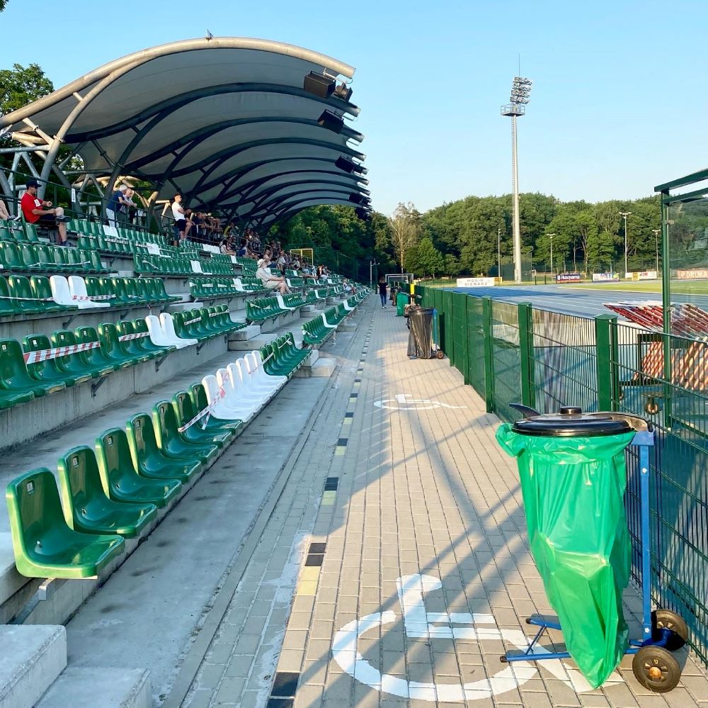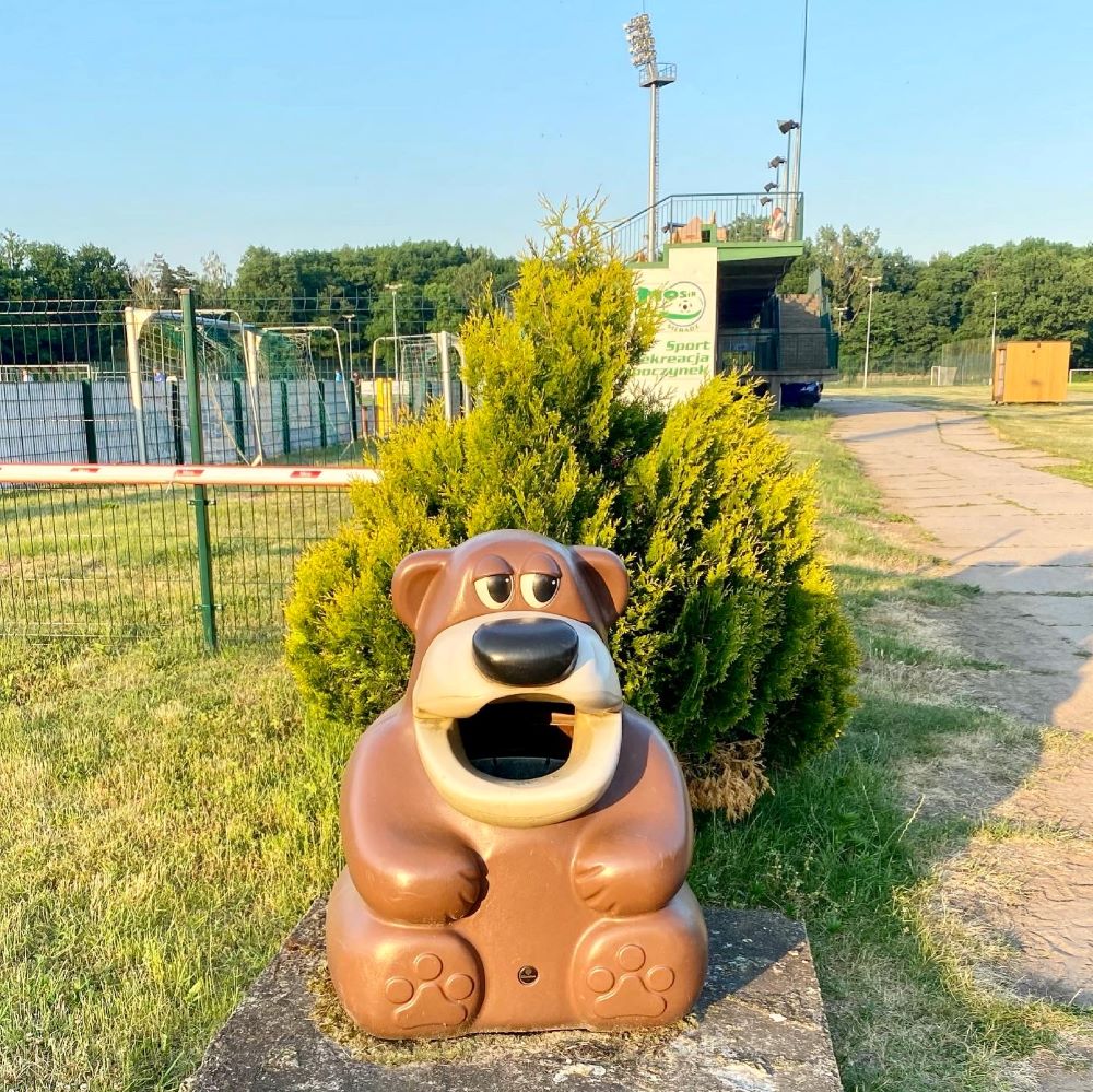 17:50 Uhr erreichten wir das städtischen Stadion am Rande der Innenstadt. Hier wurde in jüngerer Vergangenheit kräftig investiert und der ganze Sportpark machte einen gepflegten Eindruck. Mein Highlight waren die Pedalen vor den Sitzbänken an den Tennisplätzen (coole Idee eigentlich) und die Bärchenmülleimer (voll süß, oder?). Allein für diese zwei Attraktionen habe ich gerne 5 Złoty Eintritt entrichtet. Was wir dann auf der Haupttribüne sahen, war jedoch unbezahlbar. Einer der älteren Zuschauer hatte “Aber nicht heute !!!” auf dem Shirtrücken stehen. Sofort umrundenden wir den Germanophilen und feierten den Schriftzug auf der Vorderseite extrem: “Mich gibt es auch nüchtern…”. Ich bedauerte, nicht wie in Słubice ein wenig Soplica zur Völkerverständigung reichen zu können. Der hatte sich einen Schnaps auf meine Kosten redlich verdient.