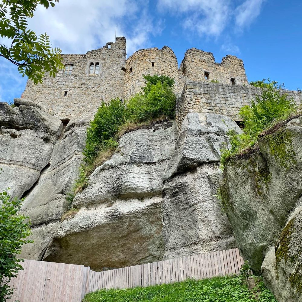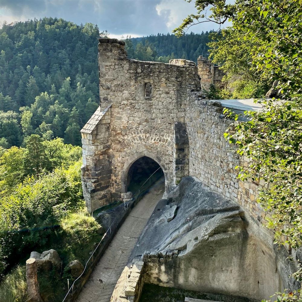Nach der Kirche muss man sich noch ein paar Stufen hochquälen, ehe man das äußere Burgtor der Ruine erreicht. Dieses kann der Besucher noch kostenlos passieren, doch vor dem zweiten Tor ist eine moderne und unbemannte Bezahlschranke mit Ticketscanner. Die Zugangsberechtigung kann man entweder im kleinen Shop am Eingang erwerben oder kontaktlos am Automaten ziehen (8 € für Vollzahler).