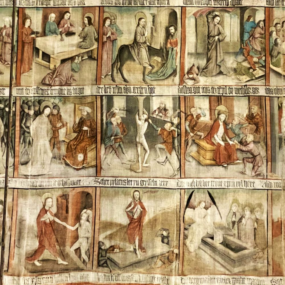 Für die Nicht-Katholiken: Mit Fastentüchern (auch Hungertücher genannt) wurde früher während der Fastenzeit der Altarraum in den Kirchen abgehangen. Neben dem obligatorischen Nahrungsverzicht, sollte sich die Gemeinde in dieser Zeit somit auch im visuellen Verzicht üben. Die Heiligtümer der Kirche waren wochenlang nicht zu sehen und der Gottesdienst konnte ausschließend hörend verfolgt werden. Vor über 500 Jahren scheint das ein krasser Entzug für den gemeinen Gläubigen gewesen zu sein. Na ja, die lebten halt auch in einer Welt, in der die Heilige Messe am Sonntag der Höhepunkt der Woche war. Arme Schweine.