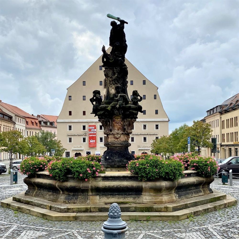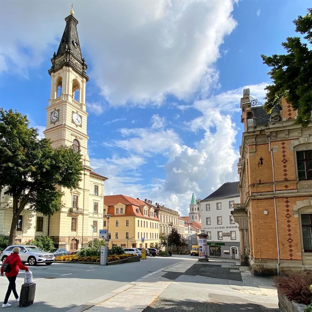 Nachdem ich intensiv den Museumkatalog über das Fastentuch gewälzt und die Museumsführerin mit Fragen gelöchert hatte, blieb von selbigen keine mehr offen. Ich überlegte, ob ich ich mir das Kleine Zittauer Fastentuch von 1573 im Stadtmuseum auch noch anschauen sollte. Es ist ebenfalls ein bedeutender Kunstschatz, dessen Licht ich nicht unter den Scheffel stellen will, aber mit 3,40 x 4,15 Metern hat es natürlich viel bescheidenere Dimensionen als das Große Fastentuch und es ist auch nicht im Feldertyp gestaltet, sondern dem Arma-Christi-Typ zuzuordnen (also lediglich die Kreuzigung als Einzelbild). Meine letzte Stunde in Zittau nutzte ich stattdessen für einen weiteren Altstadtbummel, wobei ich insbesondere nochmal den Marktplatz und das Rathaus (nach Plänen von Karl Friedrich Schinkel) in Augenschein nahm.