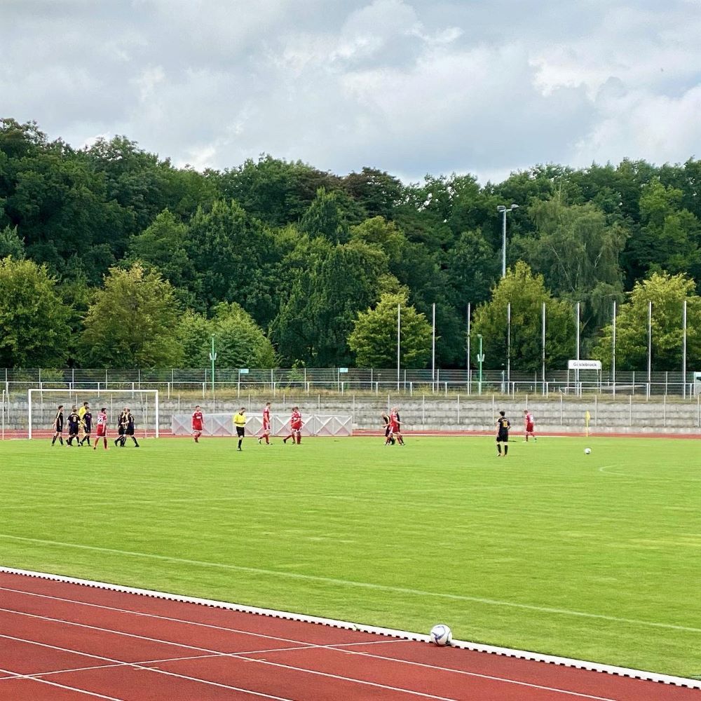 Als ich um 14 Uhr am Stadion eintraf, rollte der Ball bereits und es fiel just das 1:0 für den gastgebenden VfB durch Enrico Neumann. Der Schiedsrichter hatte anscheinend schon ein paar Minuten früher angepfiffen. Na ja, es ist nur 7.Liga, auf eine TV-Übertragung musste also keine Rücksicht genommen werden. Und wenn dann eh alle schon 13:55 Uhr startklar auf dem Rasen stehen, spricht natürlich nichts dagegen sofort anzufangen. Während meiner „Fußballkarriere“ (in der komischerweise auch kein einziges meiner Spiele im TV übertragen wurde) war das nicht anders. Wir waren damals sogar froh, wenn der angesetzte Schiedsrichter überhaupt erschien und nicht der Platzwart oder einer der drei Zuschauer pfeifen musste.