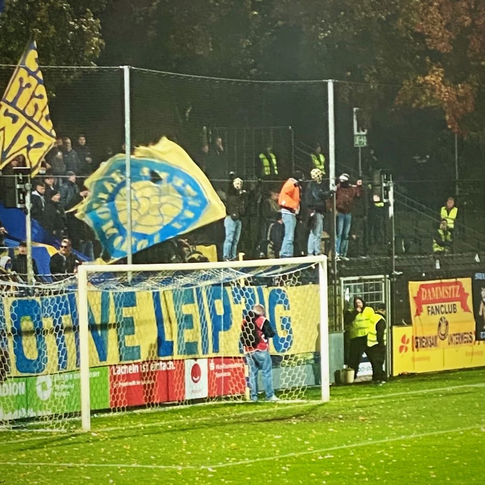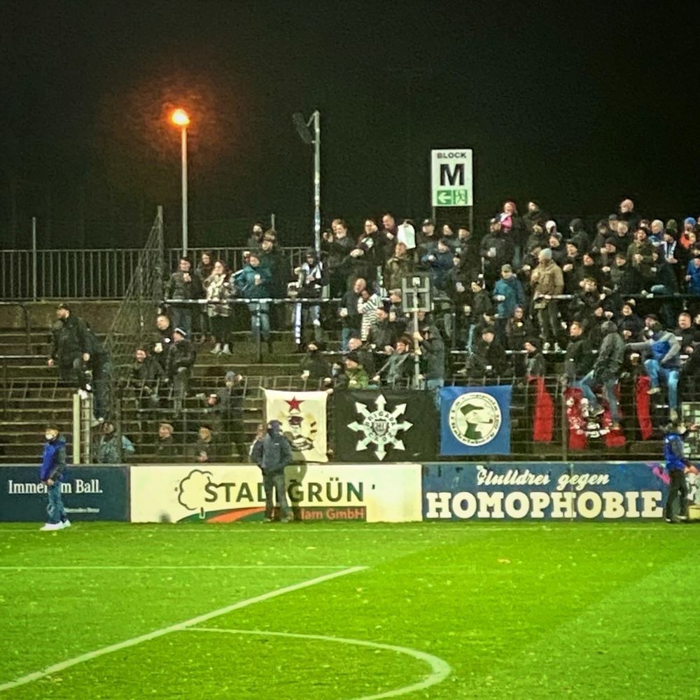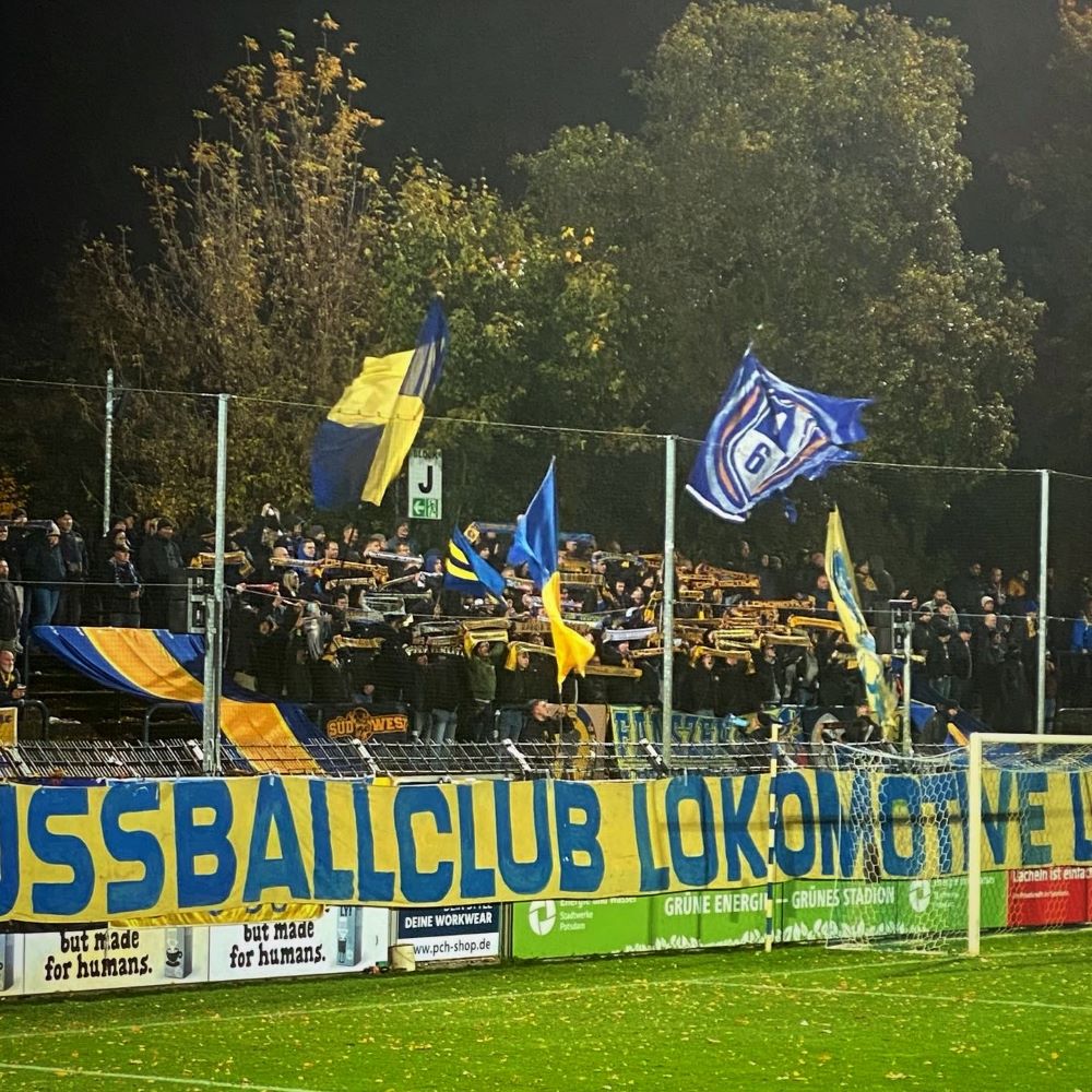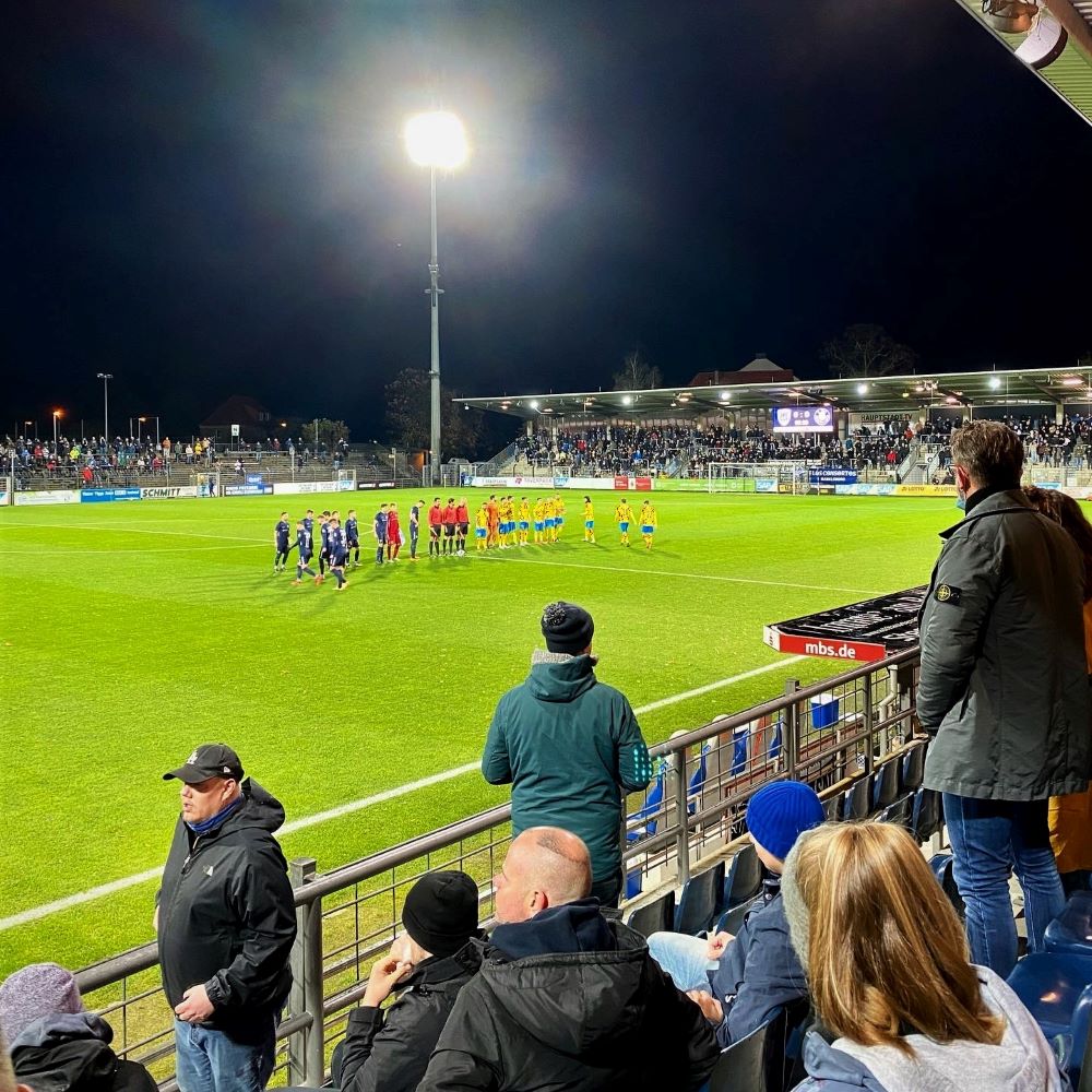 Etwa 300 bis 350 Fans des 1.FC Lok bevölkerten den Gästeblock, während die ungefähr 2.700 Fans auf den anderen drei Tribünen natürlich fast ausnahmslos dem SV Babelsburg 03 die Daumen drückten. Mit 3.030 zahlenden Zuschauern war das Spiel auf jeden Fall offiziell ausverkauft. Normalerweise passen über 10.000 Menschen auf die Ränge des Karl-Liebknecht-Stadions, aber die gegenwärtige Pandemie zwang den Veranstalter nicht nur zur Anwendung der 3G-Regel (nur Geimpfte, Genesene oder frisch Getestete durften hinein), sondern auch zu einer erheblichen Reduzierung der Kapazität.