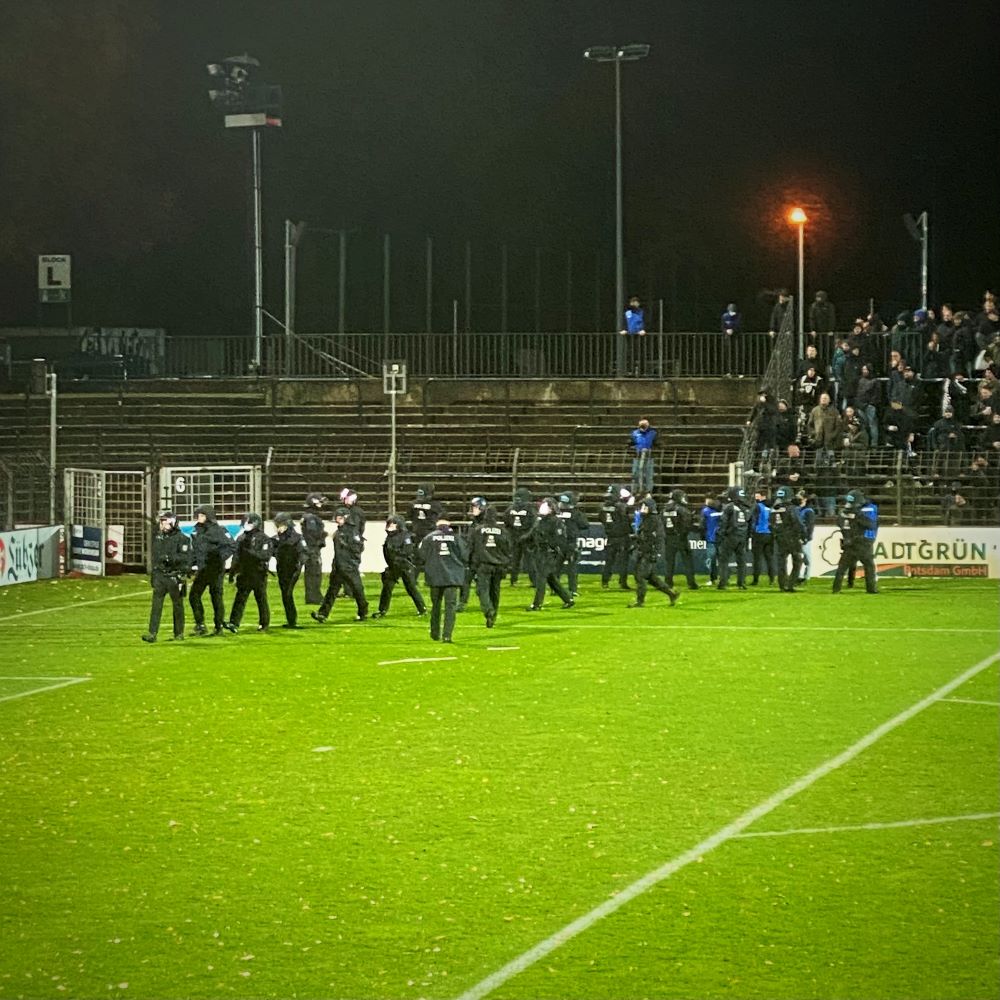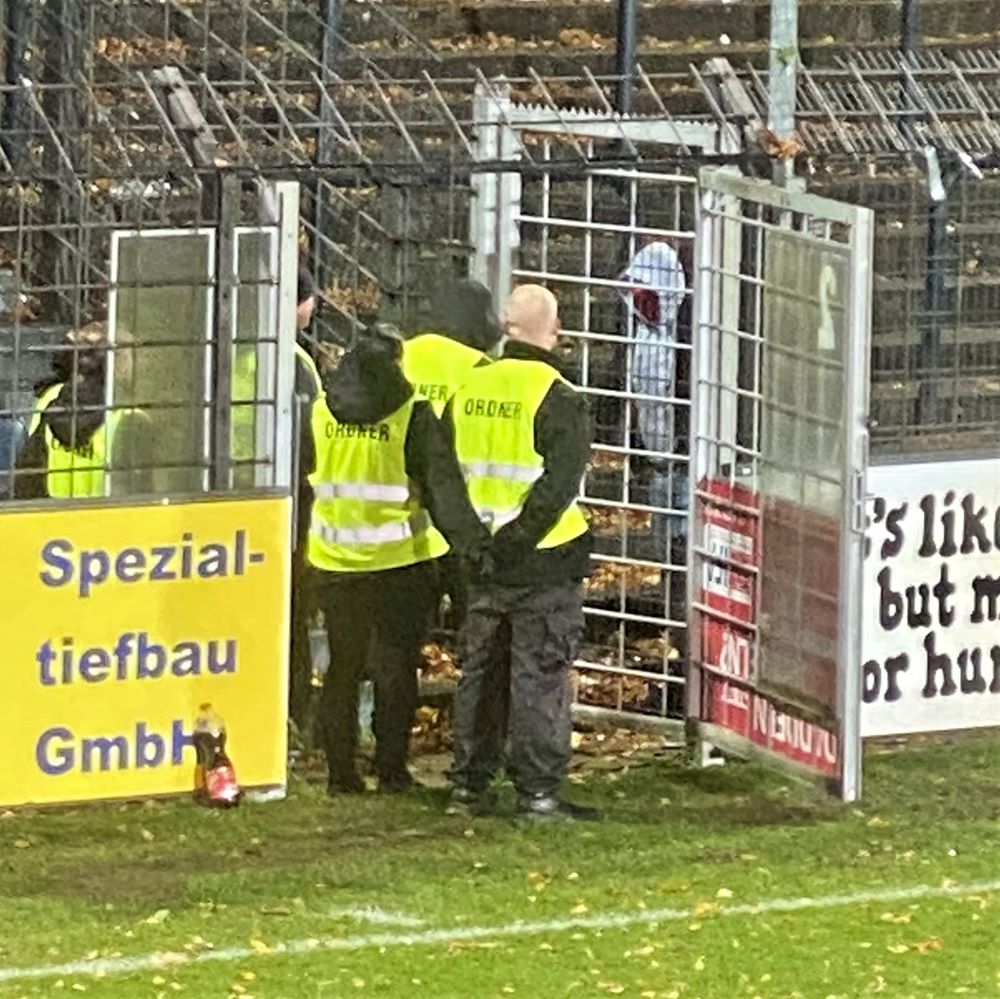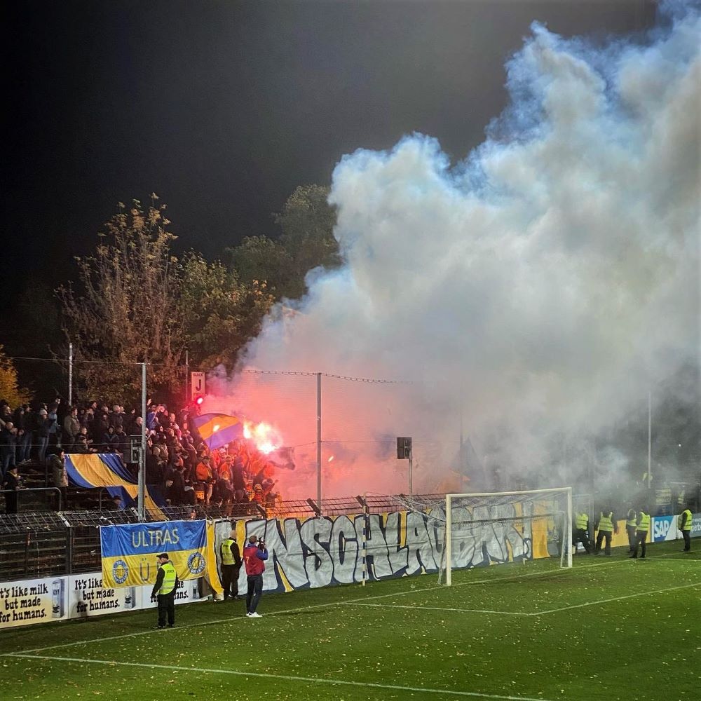 Nach 90 Minuten stand ein sportlich gerechtes 1:1 auf der Anzeigetafel und Lok bleibt damit im neunten Spiel in Folge ohne Niederlage. Unter dem großen „1.FC Lokomotive Leipzig“-Banner tauchte nun passenderweise der Schriftzug „Unschlagbar“ auf. Da auch die kleine Blockfahne mit dem Vereinswappen wieder ausgerollt wurde, dauerte es nicht lange bis erneut Sturmmaskenmenschen mit Leuchtstäben zu sehen waren. Die Leipziger setzten nochmal ordentlich gesundheitsschädliche Dämpfe frei und hatten anschließend abermals Bock ihren Block auf unorthodoxe Weise zu verlassen. Aber der Ordnungsdienst stemmte sich mit Mann und Maus gegen das Fluchttor. Die Polizei stand vorerst nur am Rand, aber irgendwann fasste sich der Einsatzleiter ein Herz und ließ seine Hundertschaften aufmarschieren.