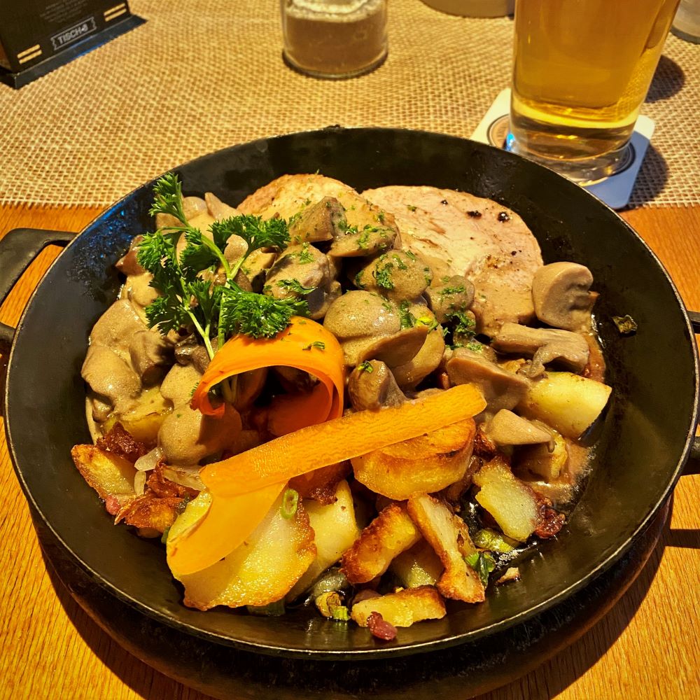Mein ersehntes Abendessen bekam ich dann wenig später im Restaurant Unicat in der Karl-Liebknecht-Straße serviert. Ich entschied mich für eine Pilzpfanne mit Schweinerückensteaks und Bratkartoffeln. Dazu das mir bisher unbekannte Bier Bergisch Löwen. Das Brauerzeugnis war jetzt nicht so der Knaller, aber das Gericht sehr lecker. Die Steaks waren superzart und die Bratkartoffeln wunderbar kross. Nur die Sauce war ein bißchen zu ölig, aber das lag wohl an der Vermengung mit den Bratkartoffeln. Zufrieden stieg ich um 22:44 Uhr in eine S-Bahn gen Berlin und lag 45 Minuten später im Hotelbett. Gelungener Auftakt des Wochenendes und tatsächlich schon über 2.500 Wörter niedergeschrieben. Dann splitten wir den Babelsberg-Berlin-Bericht lieber mal in zwei Teile…